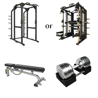 パワーラックやオールインワンマルチラックなどを使っています。パーツを変えて色々な種目ができますが、パーツ変更やプレート(重り)の付け替えにはそれなりの時間が掛かります。